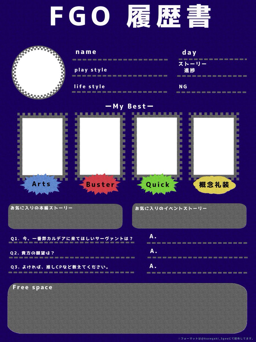 千垣 Twitterren 少し変わった視点から Fgo履歴書を作成しました フリー素材なので許可不要です サンプルみたいな感じで お好きにお使いください アカウント乗っ取り防止のため あえてサポート欄等作ってないです Fgo Fgo履歴書 フリー素材